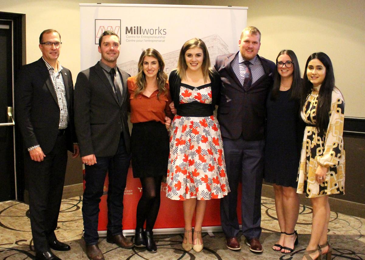At Bridges to Better Business 2019 are (L to R) SSMEDC Executive Director Dan Hollingsworth, pitch off runners-up Brent Rouble and Gillian Gordon from IPI Creations, contest winners Erica and Spencer Hogan from Hogan’s Homestead Products, SSMEDC Economic Development Officer Jessica Maione, and SSMEDC Millworks Manager Harleen Puaar Shukla.